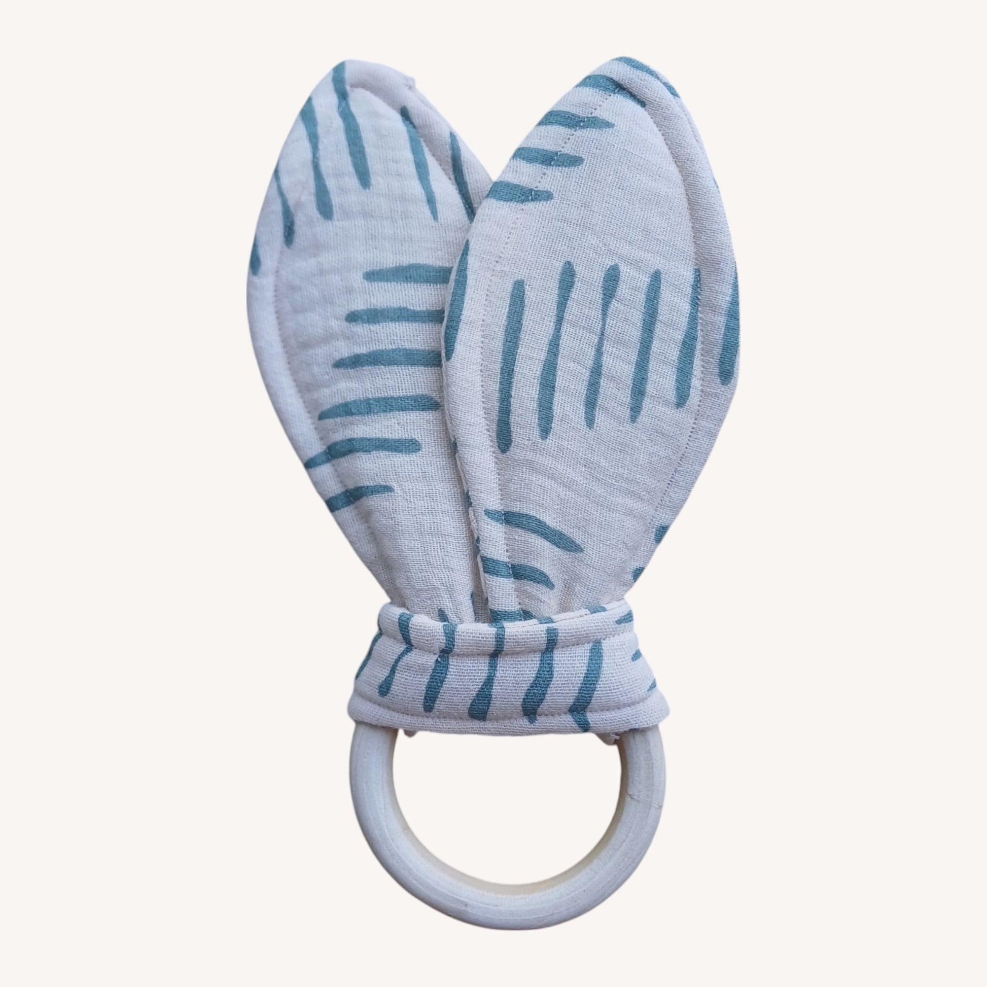 Bijtring met konijnenoren in een crèmekleurige stof met mint kleurige strepen. De ring is gemaakt van onbehandeld glad hout.