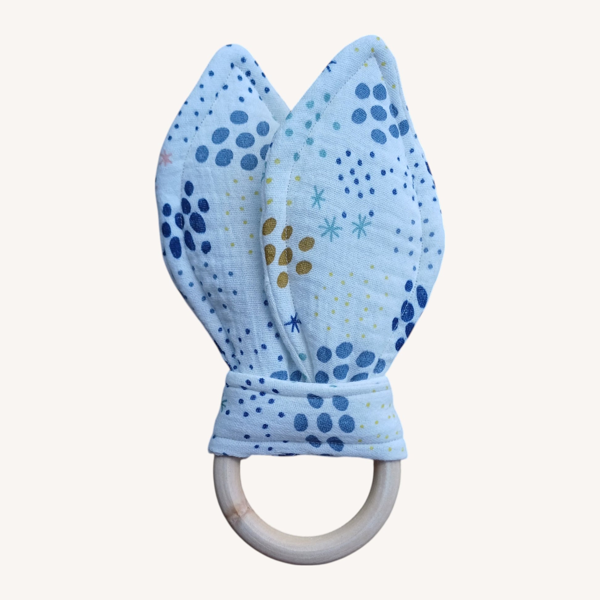 Bijtring met konijnenoren in een witte stof met stippen in verschillende kleuren. De ring is gemaakt van onbehandeld glad hout.