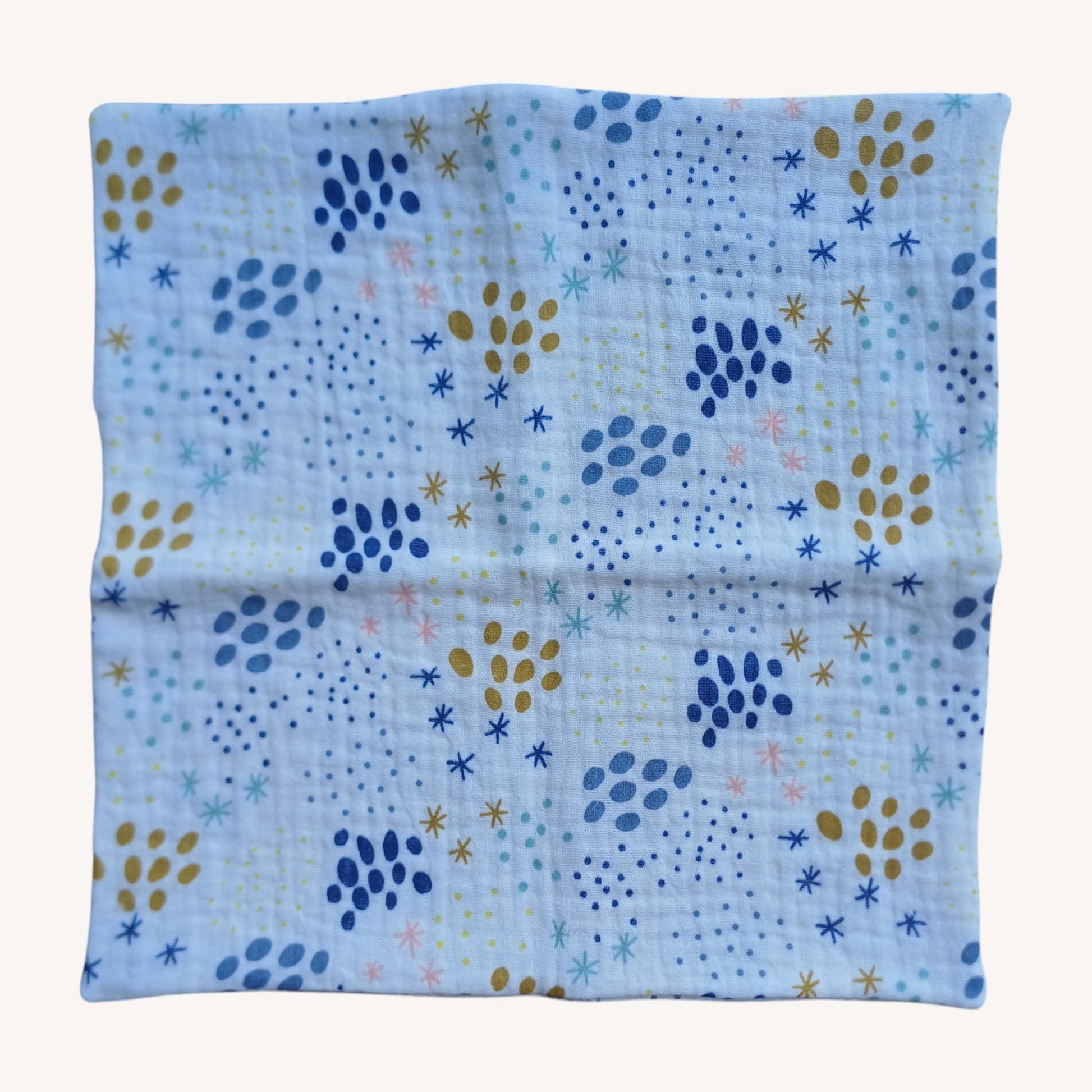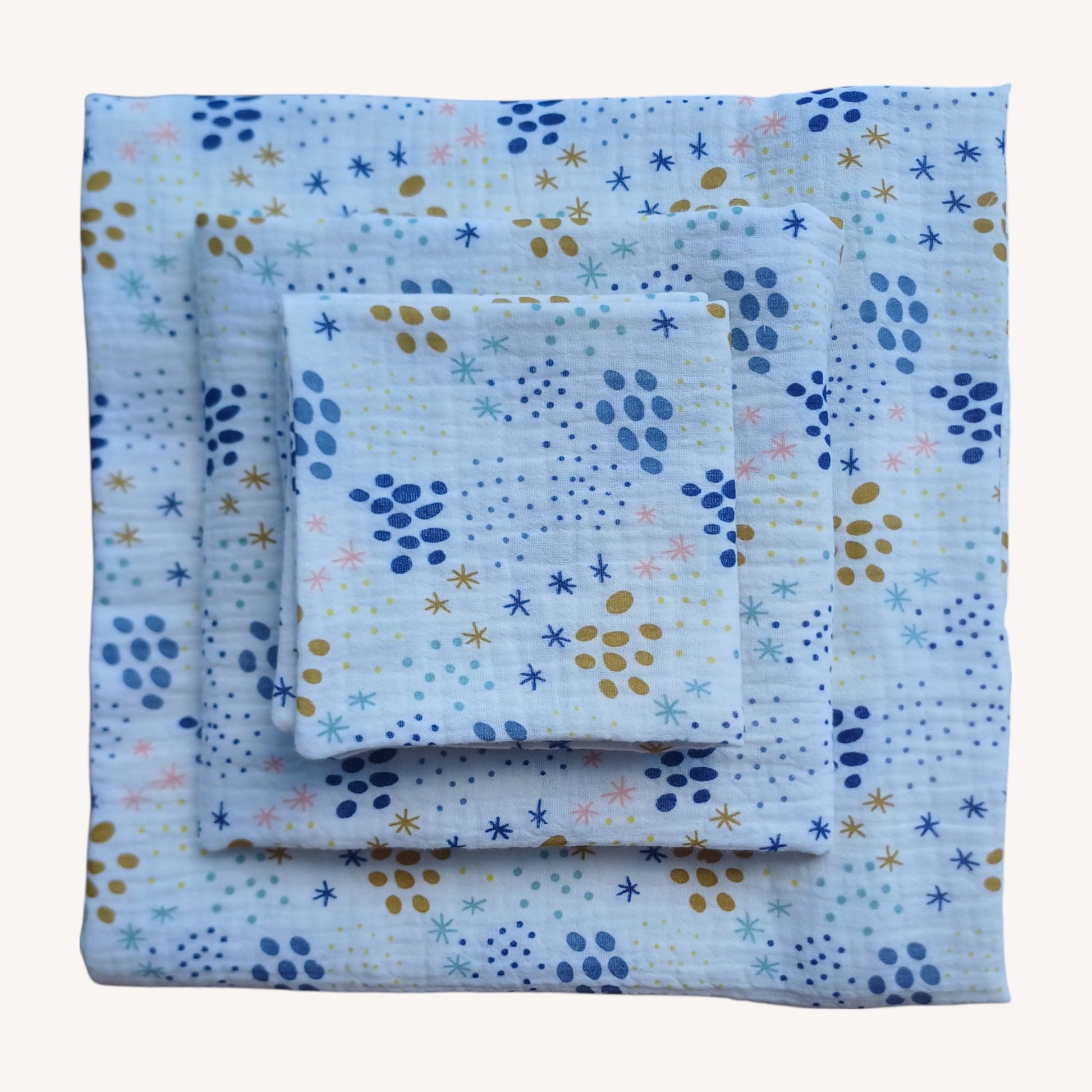Witte hydrofieldoek met stippen in verschillende kleuren. De doek is beschikbaar in drie maten: klein, middel en groot.