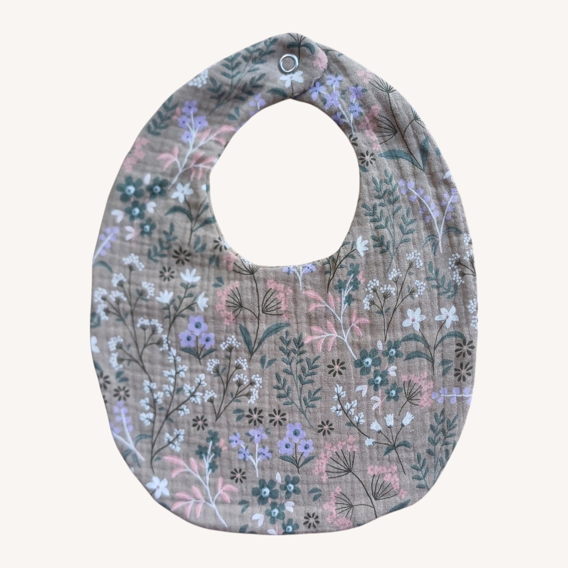 Slabbetje in een donkere crèmekleurige stof met bloemen en planten. In de nek vast te zetten met een drukknoopje.