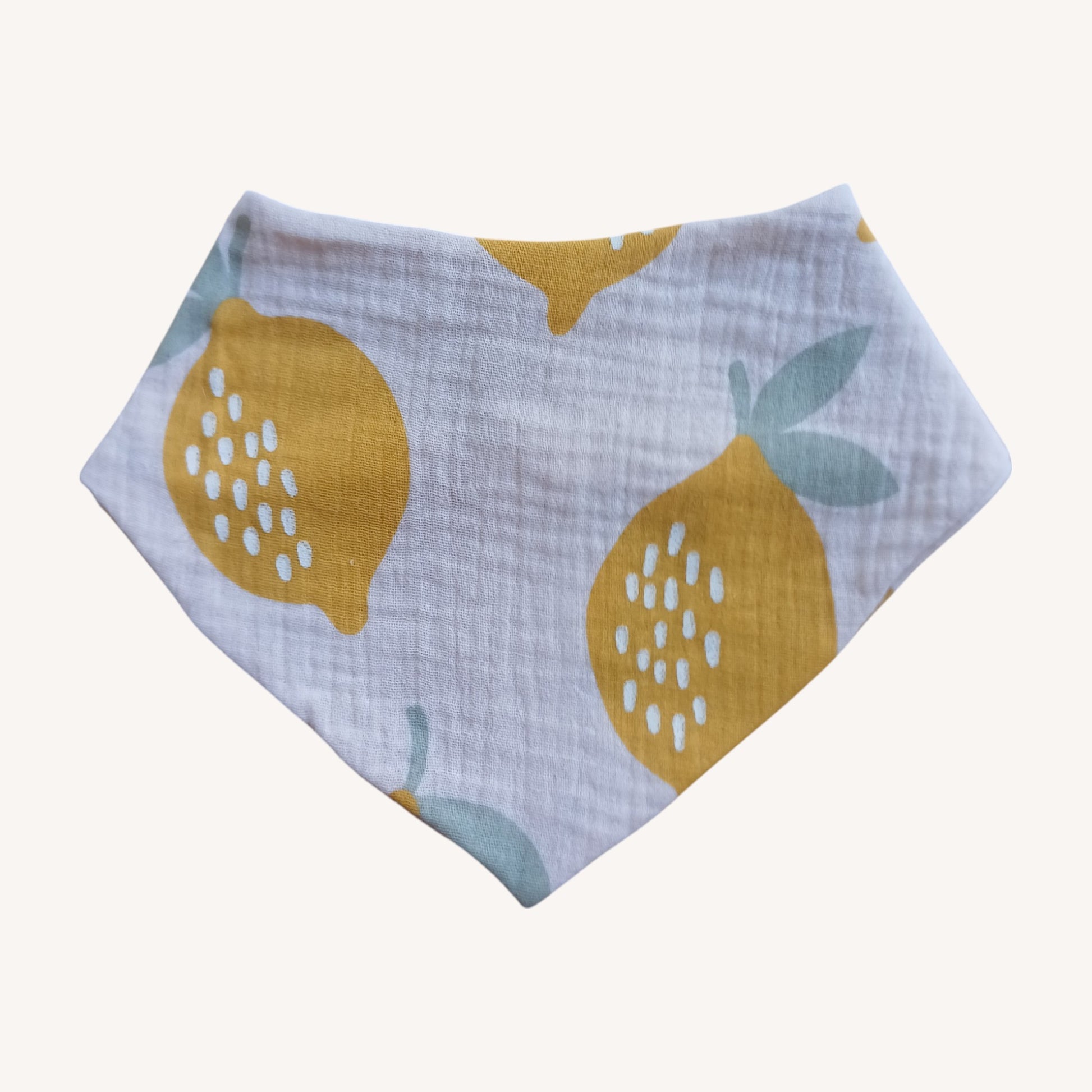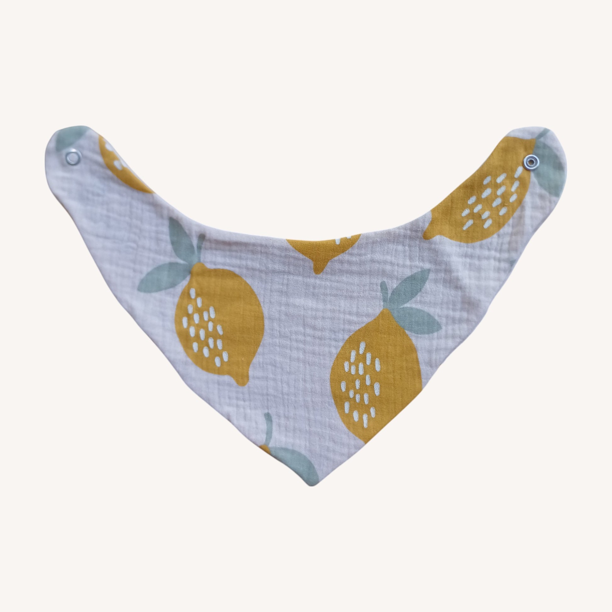Slabbetje in een crèmekleurige stof met citroenen. In de nek vast te zetten met een drukknoopje.