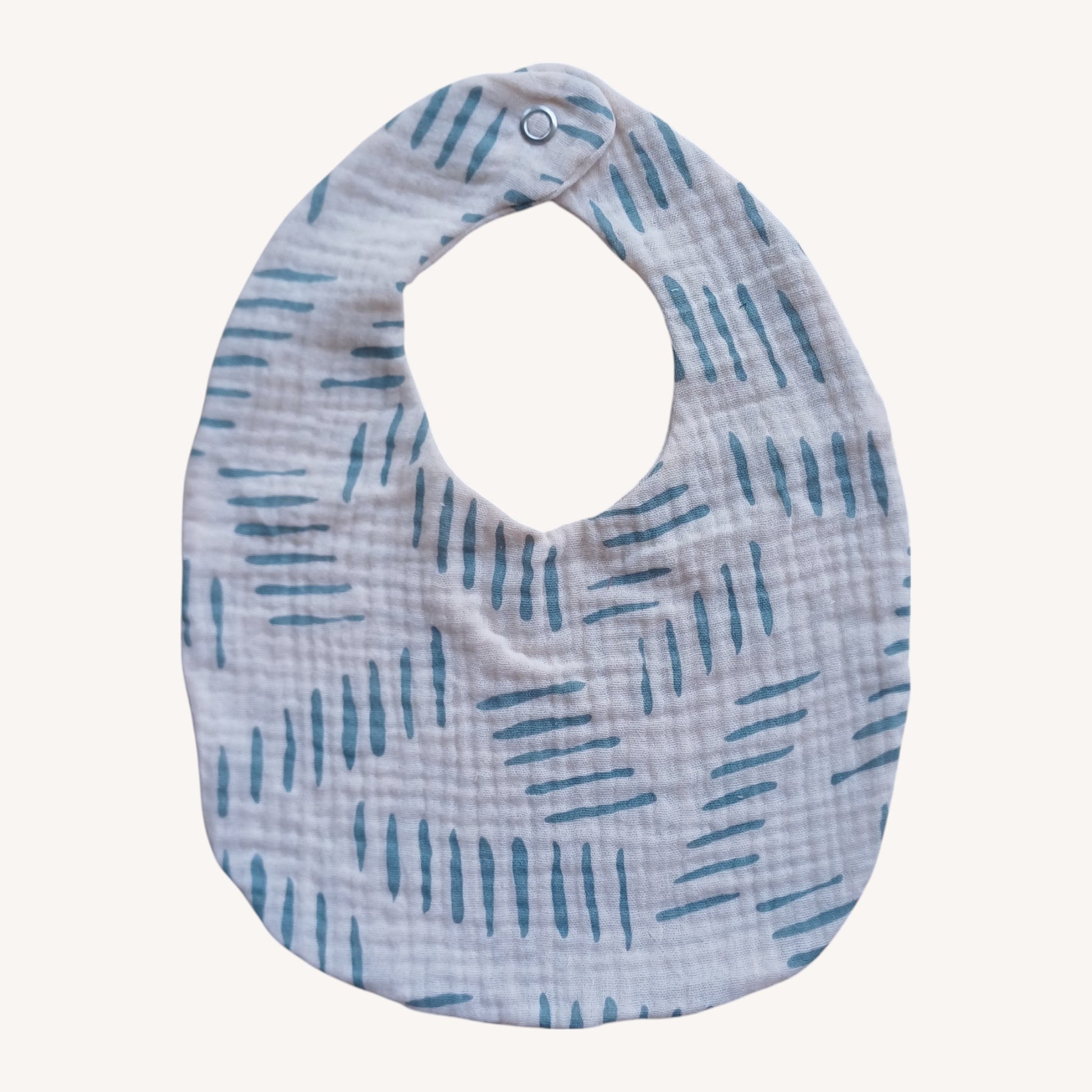 Slabbetje in een crèmekleurige stof met mint kleurige strepen In de nek vast te zetten met een drukknoopje.