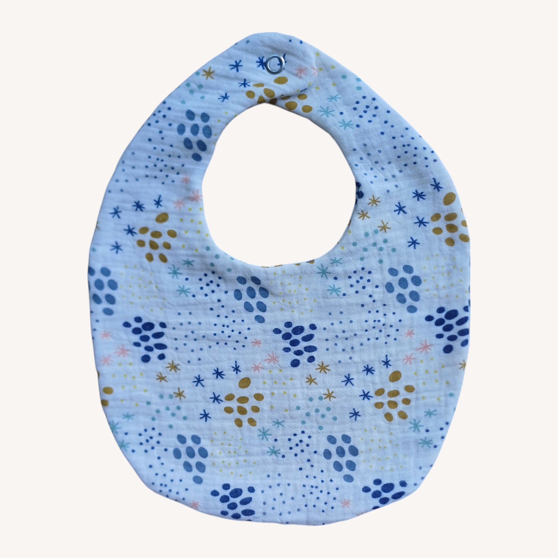 Slabbetje in een witte stof met stippen in verschillende kleuren. In de nek vast te zetten met een drukknoopje.