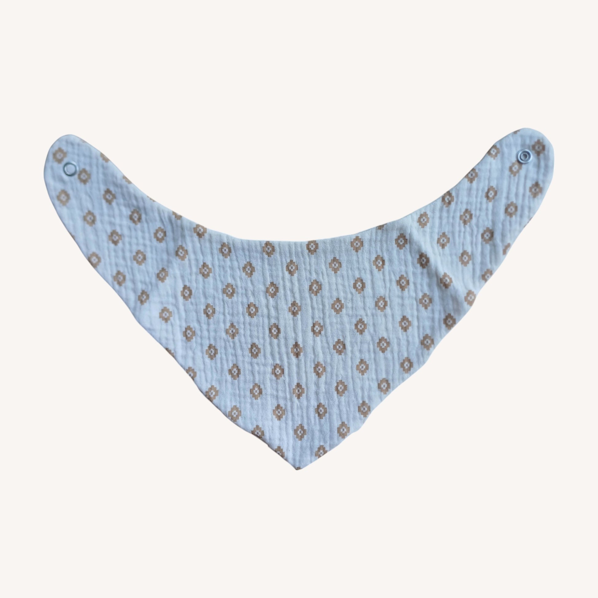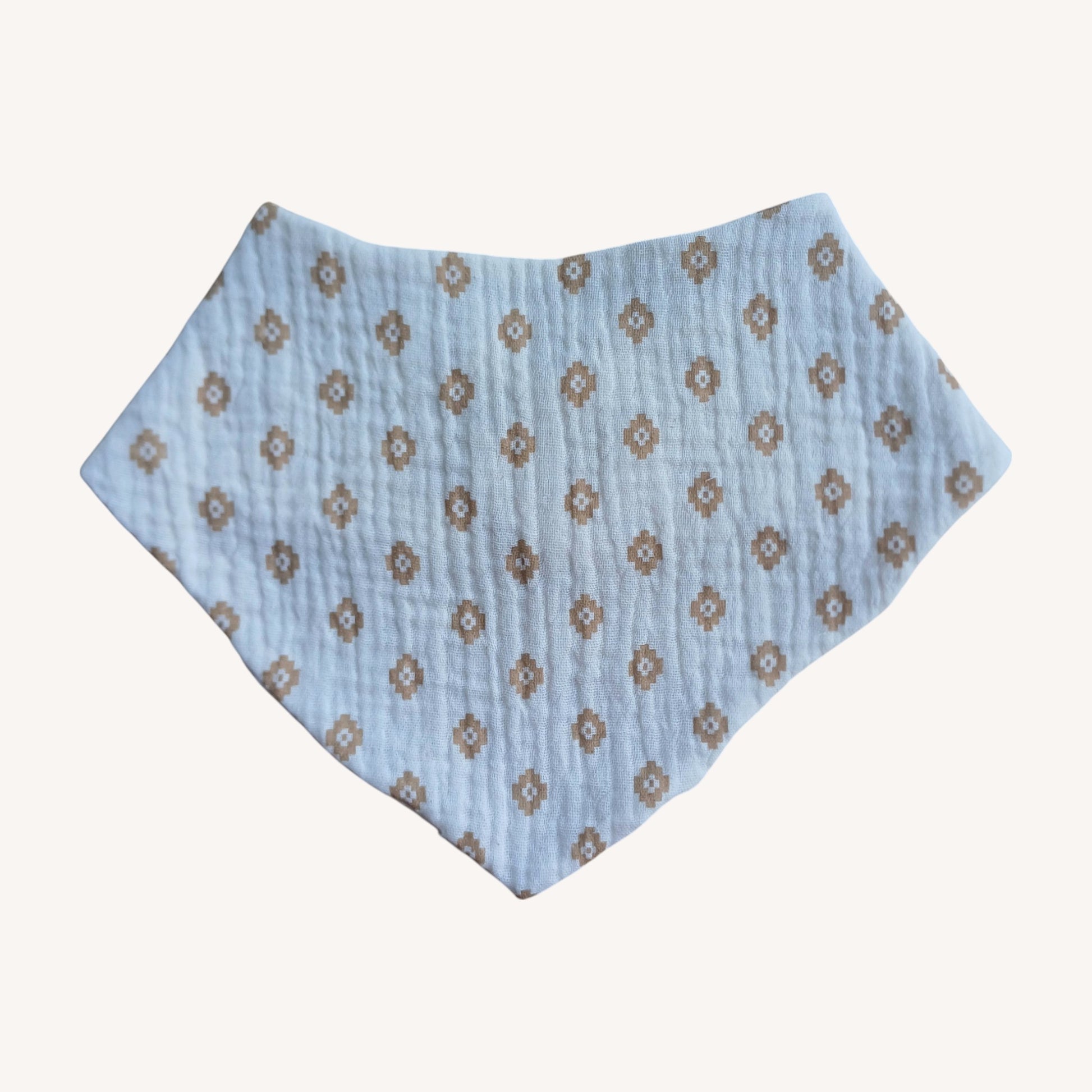 Slabbetje in een crèmekleurige stof met abstracte vormen in de kleur terra. In de nek vast te zetten met een drukknoopje.
