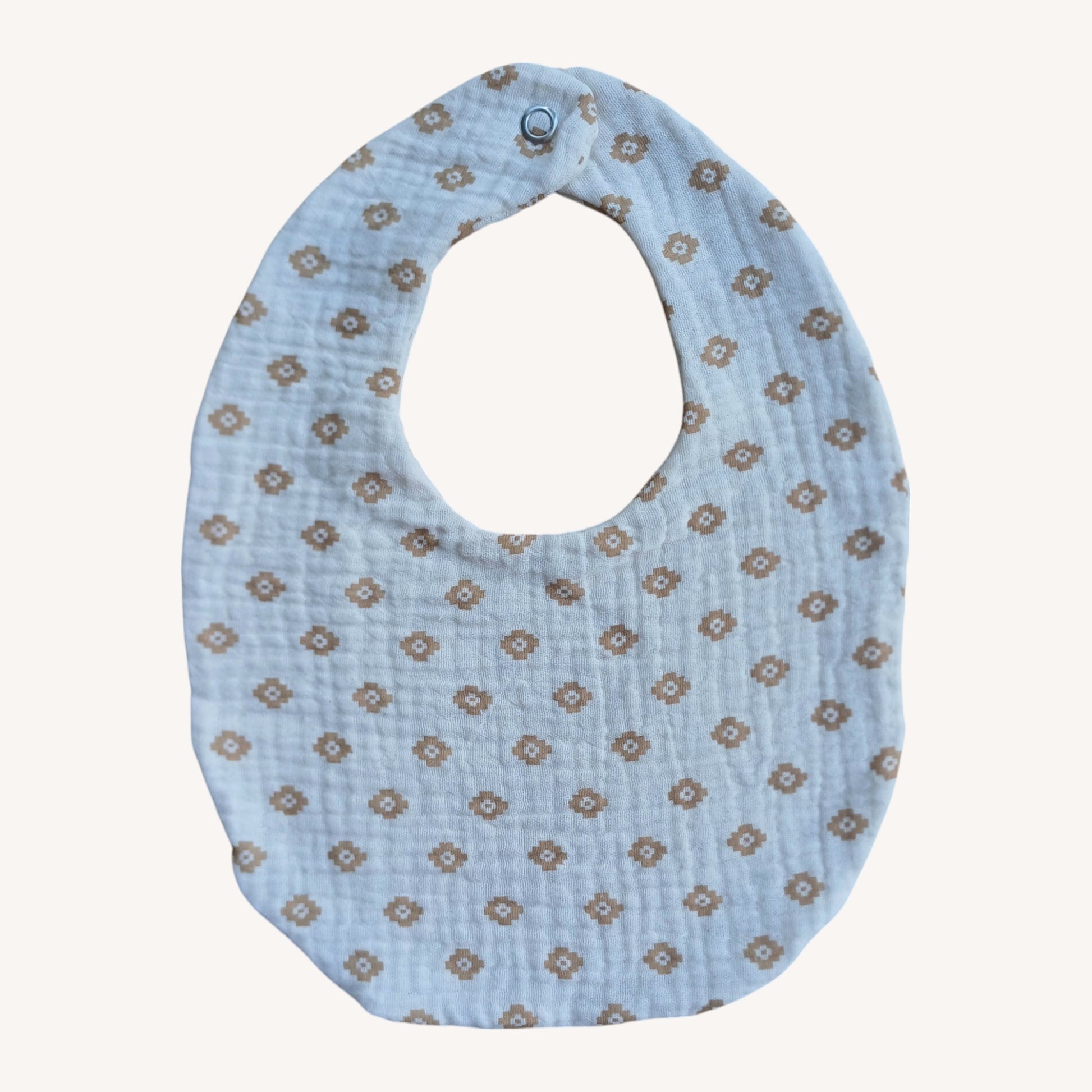 Slabbetje in een crèmekleurige stof met abstracte vormen in de kleur terra. In de nek vast te zetten met een drukknoopje.