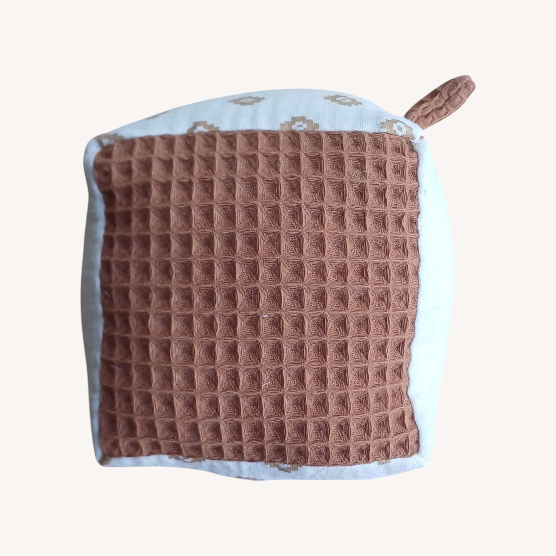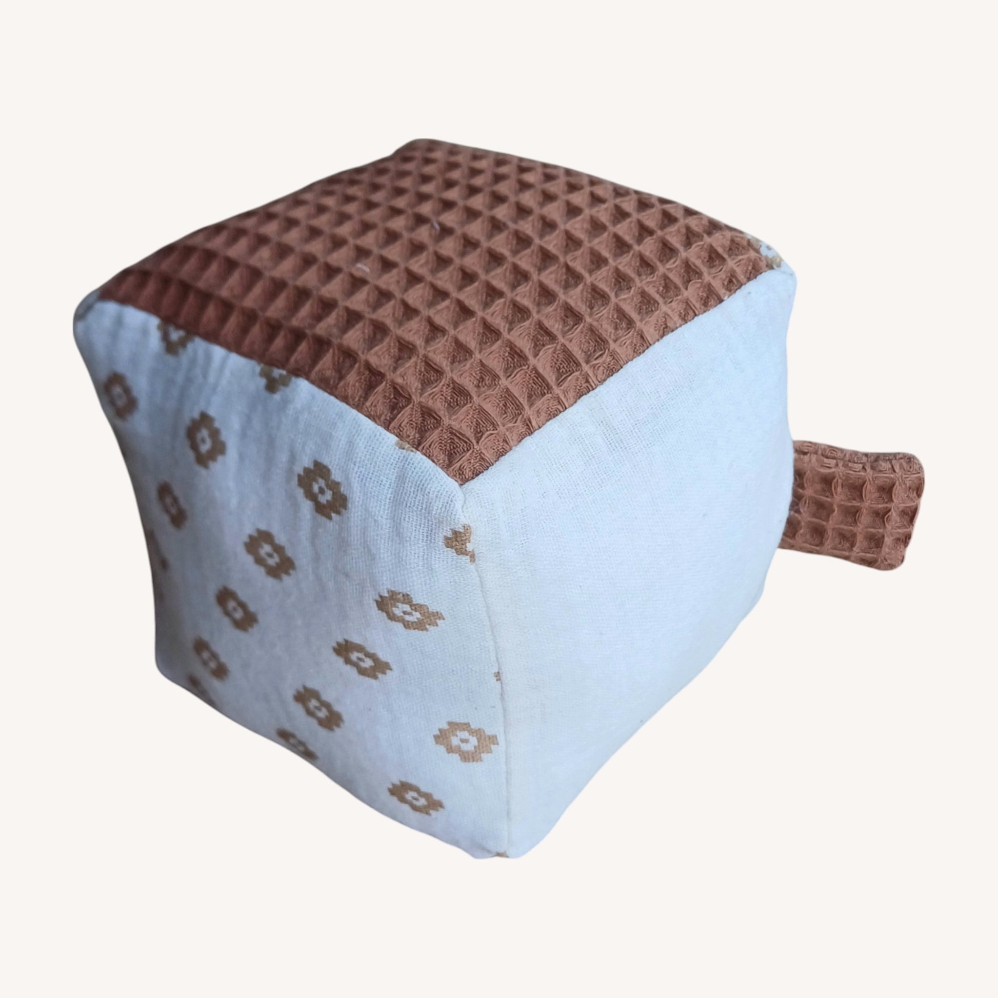 Speelkubus met een rammelaar in verschillende stoffen en kleuren.