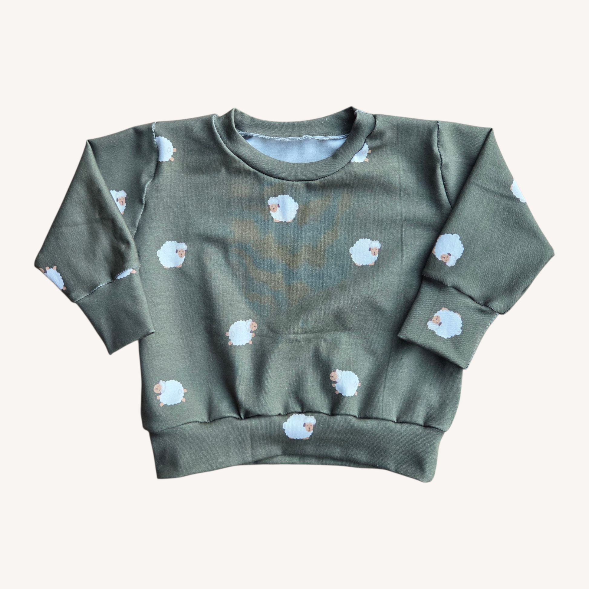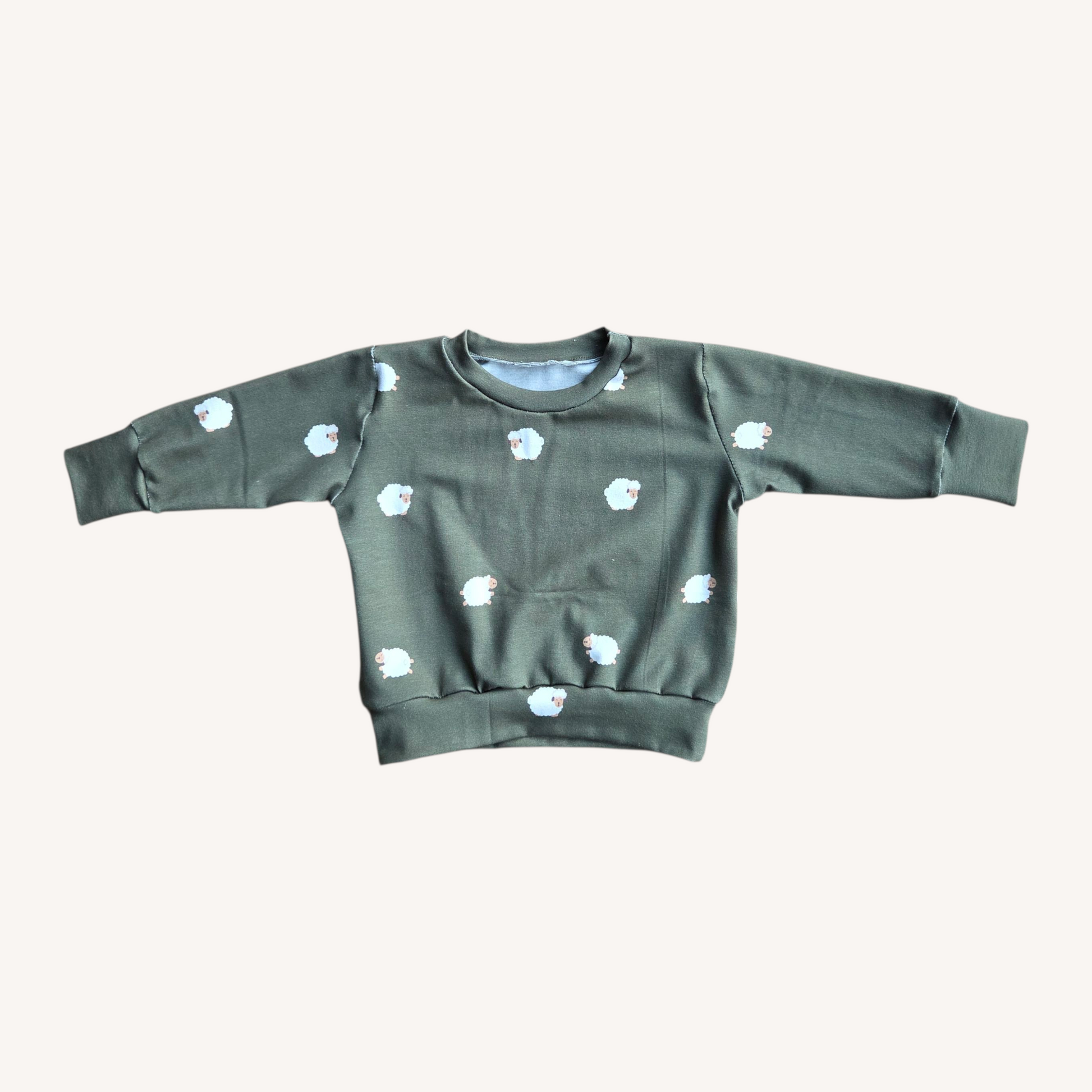 Soepel vallende groene trui van tricot met witte schaapjes.