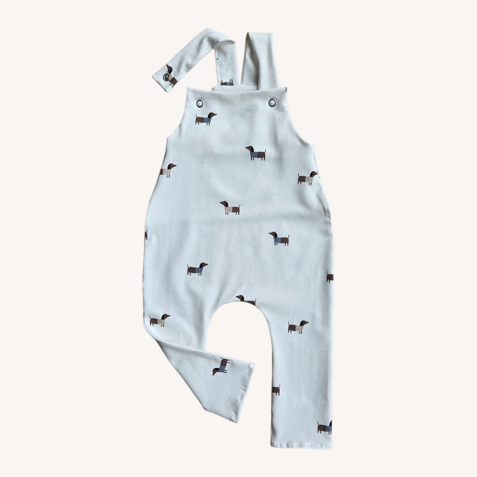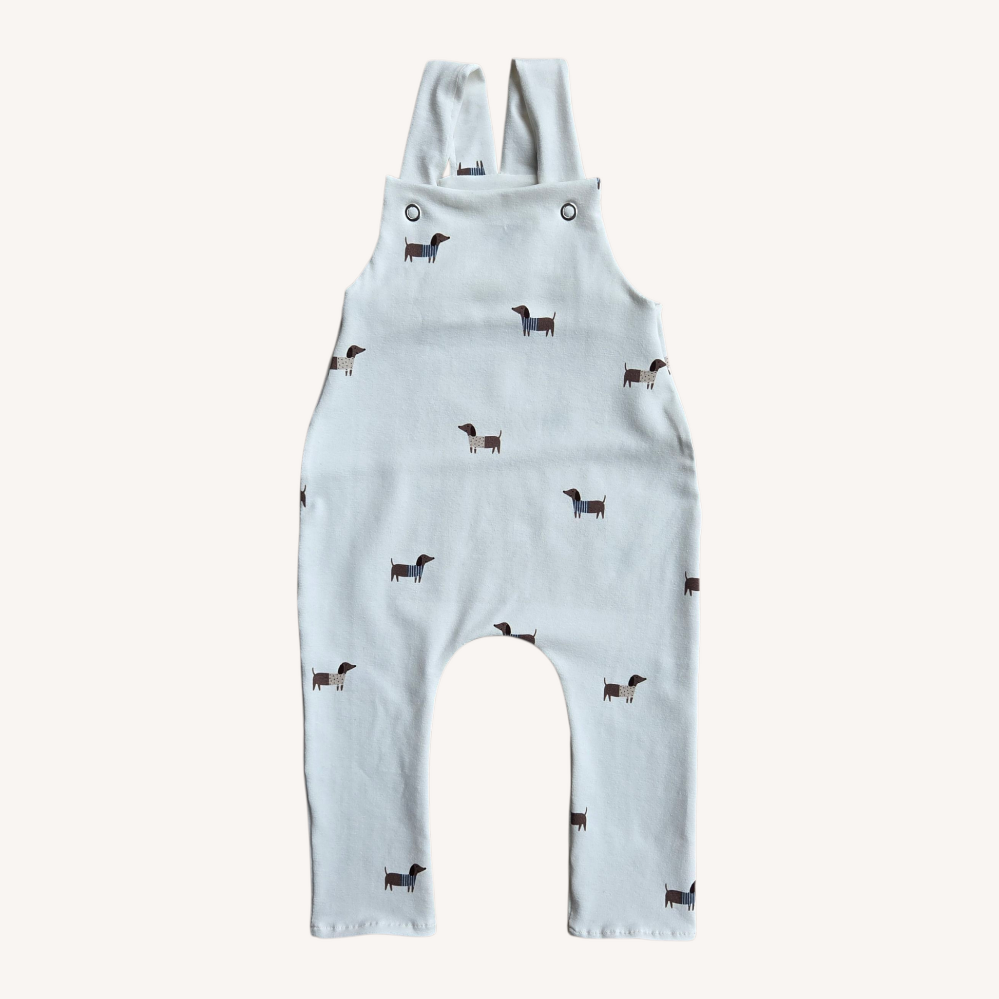 Soepel vallende witte tuinbroek van tricot met vrolijke teckels. De tuinbroek kan worden vastgemaakte met twee drukknoopjes.