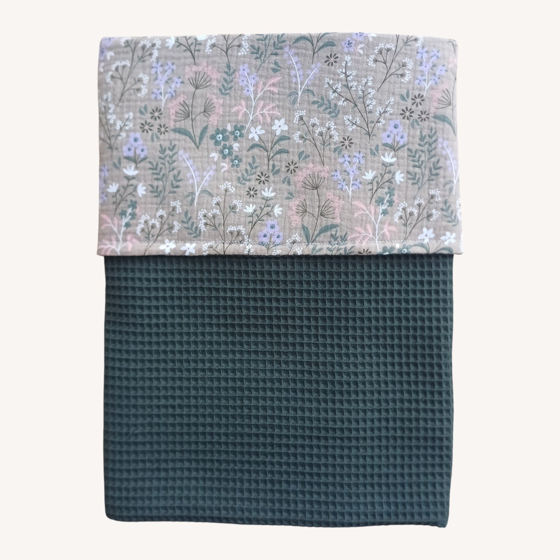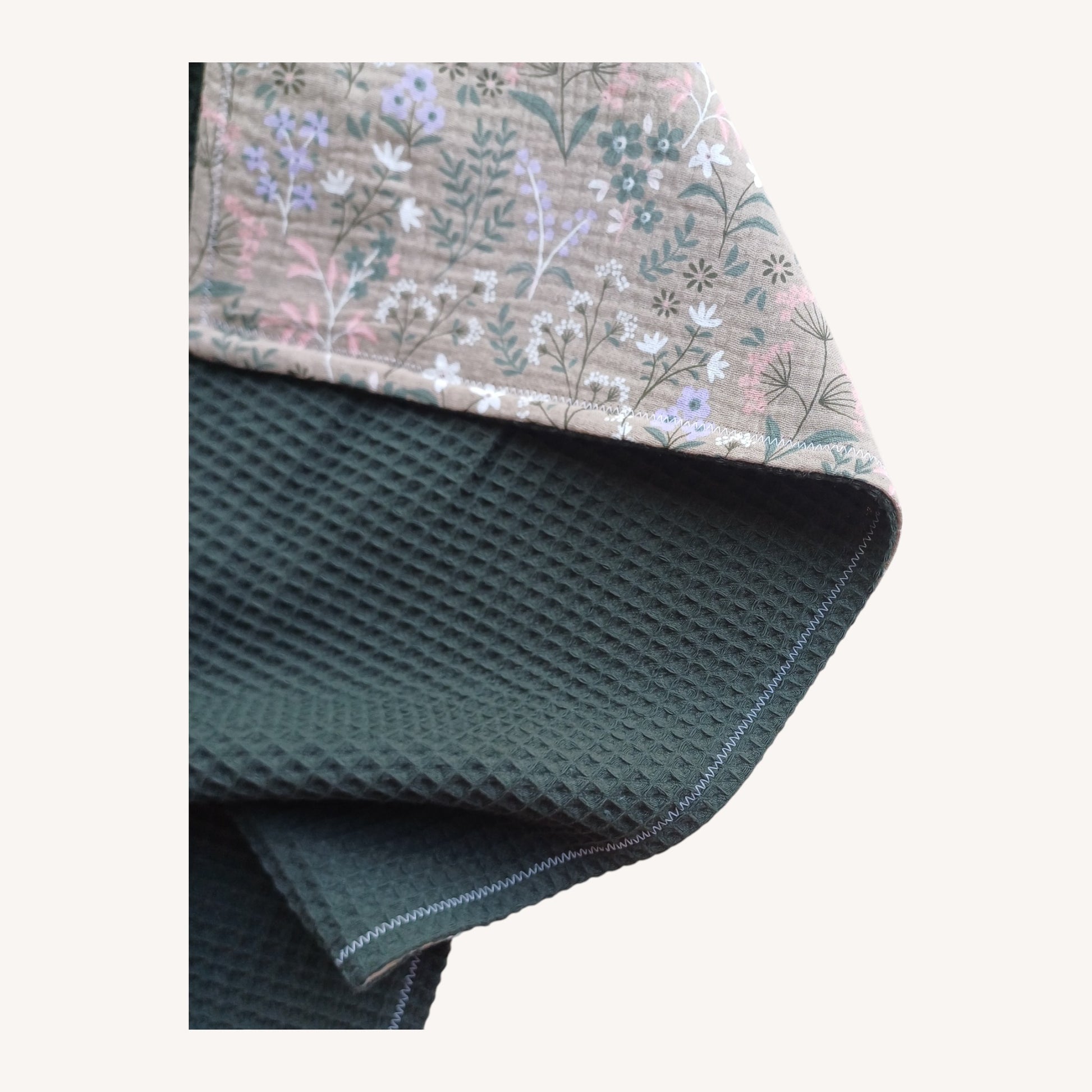 Een babydeken van wafelstof in de kleur donkergroen. Aan de andere kant heeft de deken een hydrofiel stof met bloemen en planten. De deken is afgewerkt met een sierstiksel.