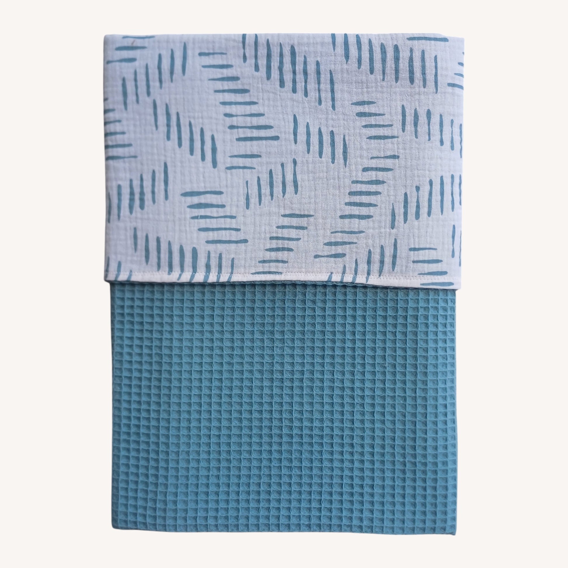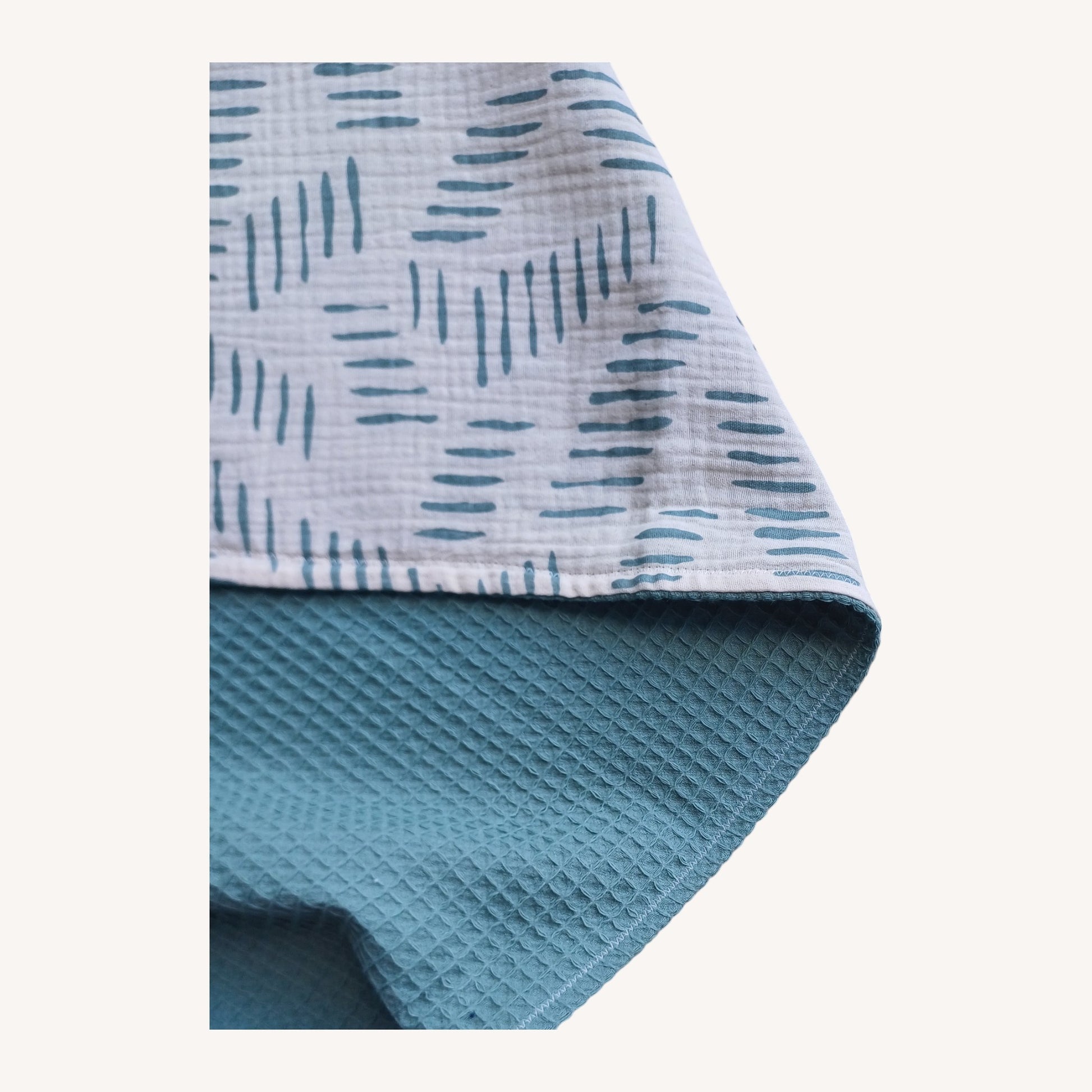 Een babydeken van wafelstof in de kleur mint. Aan de andere kant heeft de deken een hydrofiel stof met streepjes. De deken is afgewerkt met een sierstiksel.